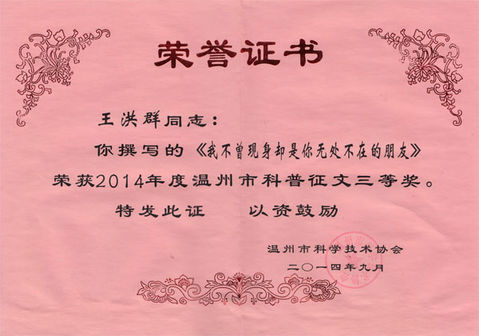 我司技術(shù)中心教授級高工王洪群同志撰寫的《我不曾現(xiàn)身卻是你無處不在的朋友》榮獲“2014年度溫州市科普征文三等獎”。